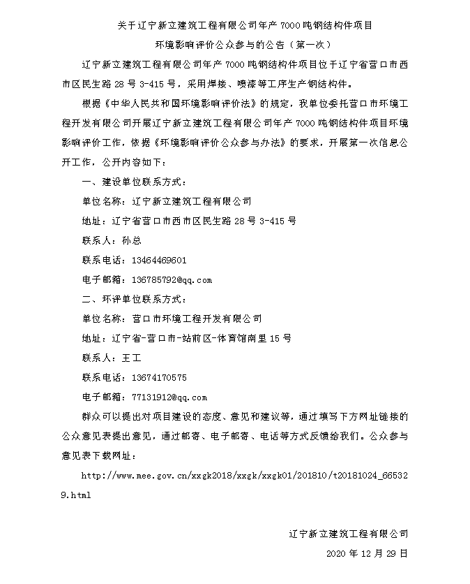 關(guān)于遼寧新立建筑工程有限公司年產(chǎn)7000噸鋼結(jié)構(gòu)件項(xiàng)目環(huán)境影響評價(jià)公眾參與的公告(第一次)