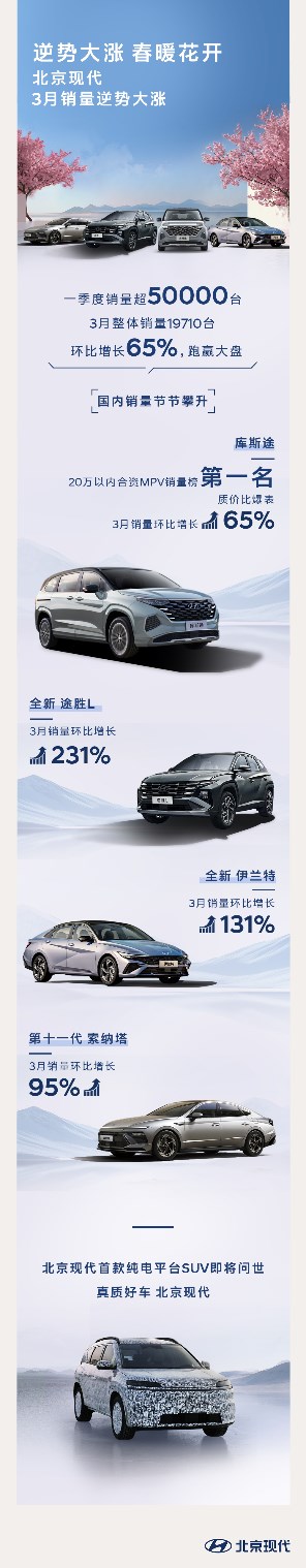 具體來說,庫斯途3月環(huán)比增長65%,位列20萬以內合資MPV銷量榜第一;全新伊蘭特3月銷量環(huán)比增長達131%;第十一代索納塔3月銷量環(huán)比增長95%;全新途勝L3月銷量環(huán)比增長更是高達231%。