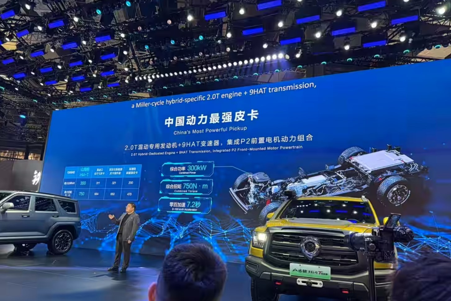 在發(fā)布會現(xiàn)場,官方稱長城山海炮Hi4-T為“中國動力最強皮卡”,搭載2.0T發(fā)動機+9HAT變速器+P2前置電機組成的插混動力,綜合功率300千瓦,綜合扭矩750牛·米,百公里加速7.2秒,而這輛車的到來,也標(biāo)志著長城皮卡正式邁入新能源領(lǐng)域。